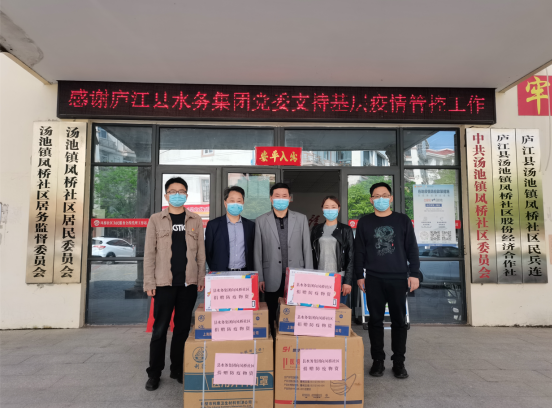 2022年4月20日,县水务集团一行四人走进庐江县汤池镇凤桥社区,代表集团党委慰问坚守在抗疫一线的驻点工作人员,并捐赠医用口罩、84消毒液、酒精等防疫物资,以实际行动为基层抗疫贡献力量。